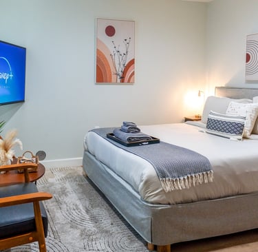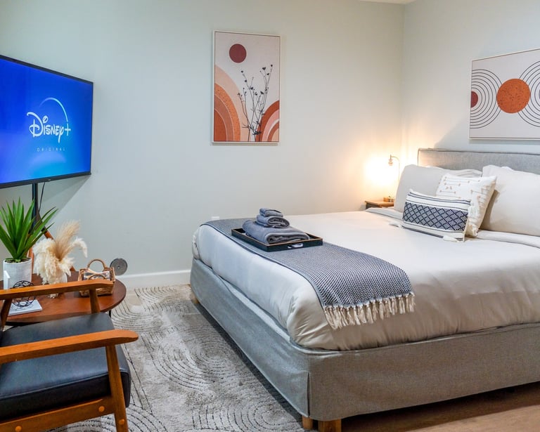 Perfect for short & extended stays, it features Smart 4K HDTVs, an in-unit washer/dryer, and many more extras. Each bedroom has comfortable beds & all the essentials needed.