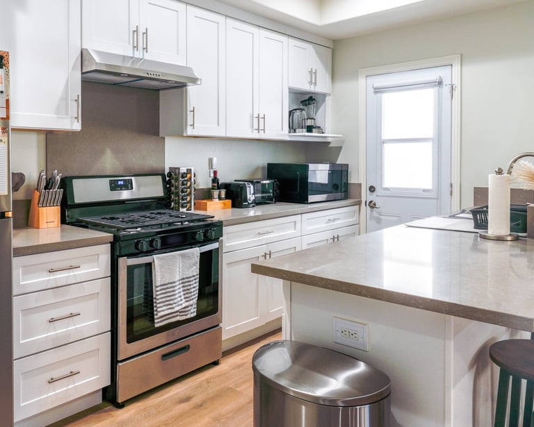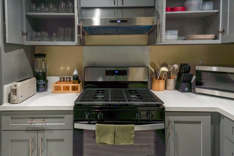 + Pots/pans, kitchen knives, basic condiments, cooking spices, cooking oils, salt, pepper, bakeware, dinnerware for adults & kids, wine glasses, cups, coffee mugs, plates, bowls, dishes, cooking utensils, measuring cup, blender, toaster, and more!